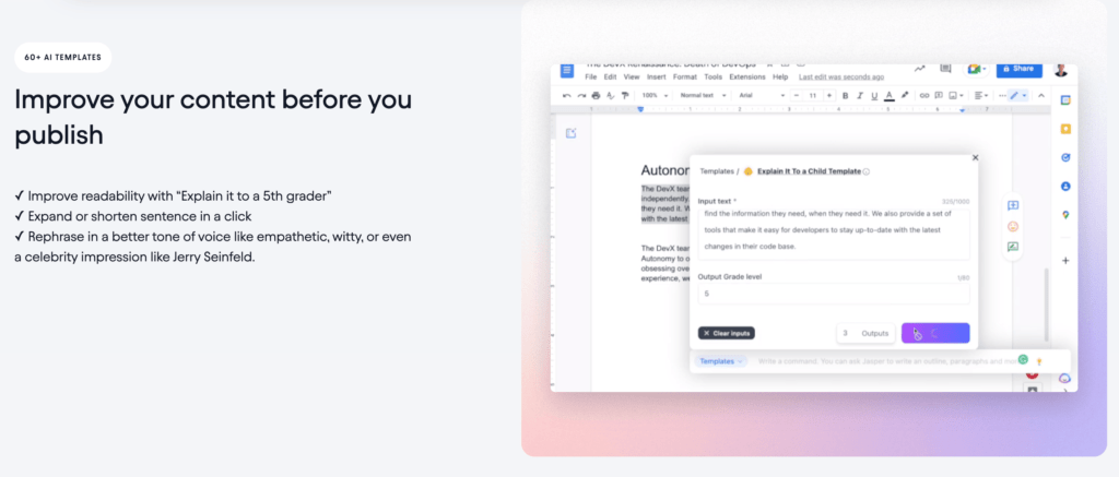 - Personalized user experience: Jasper.ai’s algorithms learn from user behavior and preferences over time, providing personalized suggestions and recommendations for content improvement.