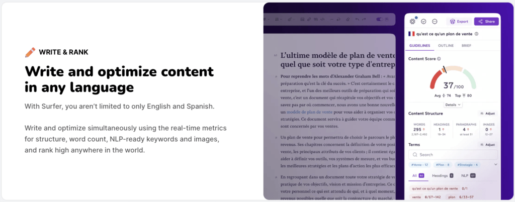 - SERP Analyzes top-ranking pages to provide insights on word count, keyword density, and content structure.