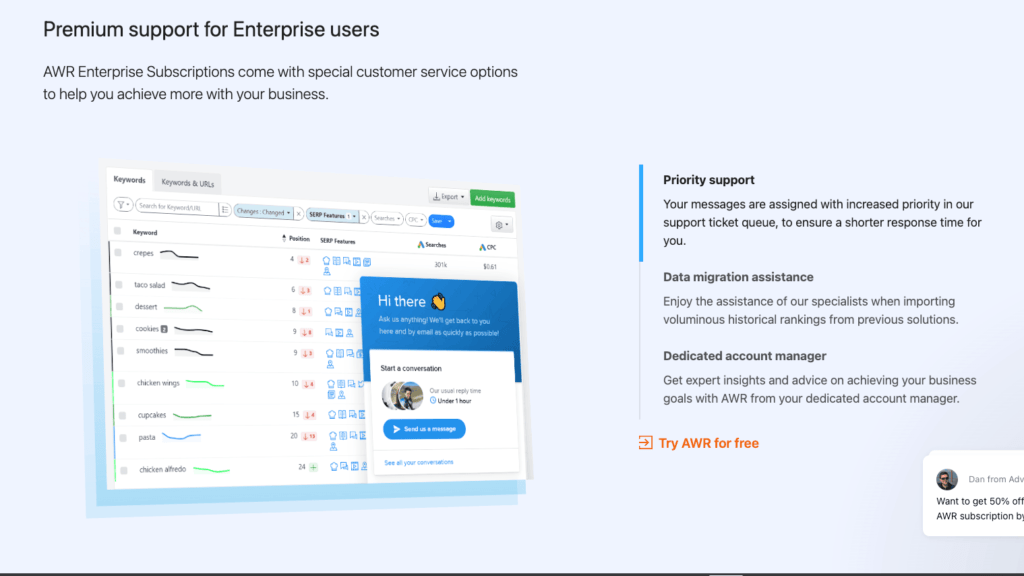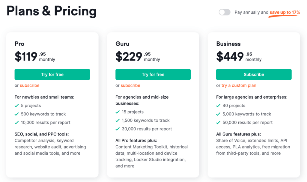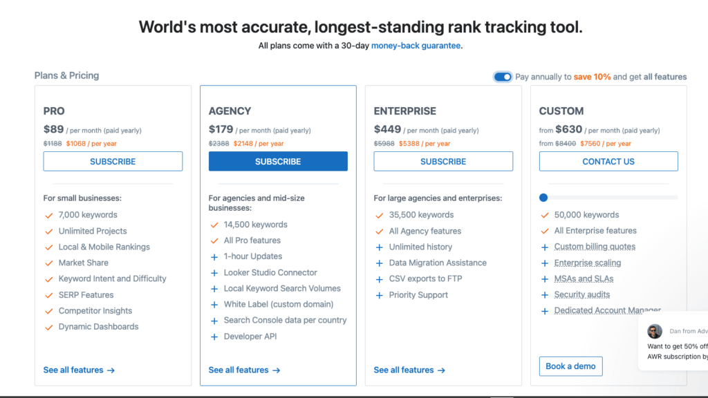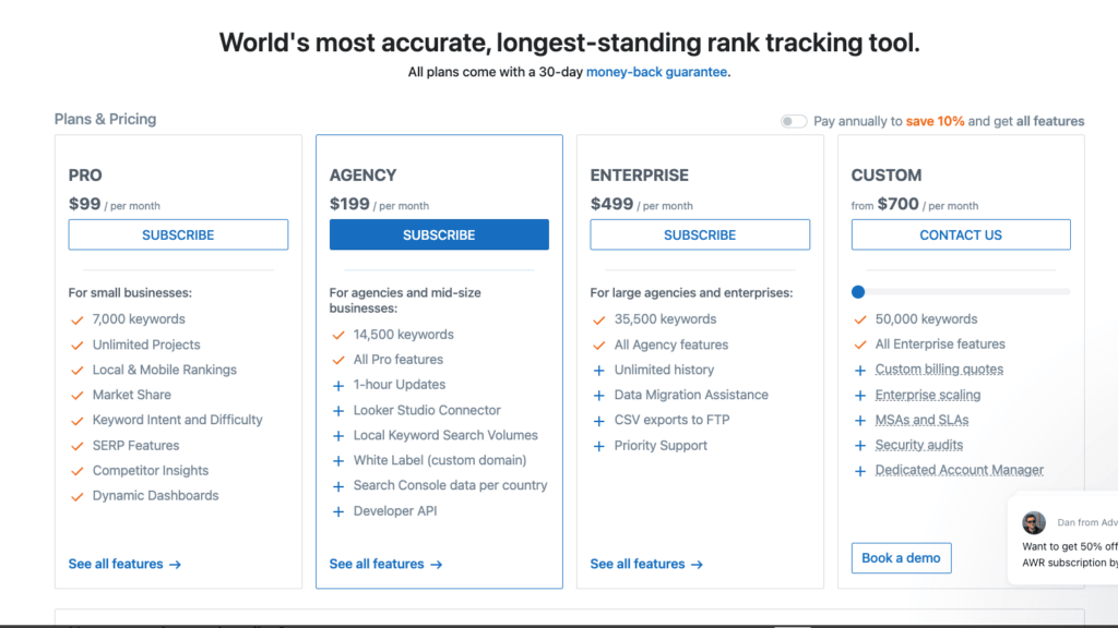 - Advanced Plan: The Advanced plan is priced at $299 per month and is designed for larger businesses and marketing agencies. It includes all Standard plan features along with priority support, white-label reports, and additional API units.