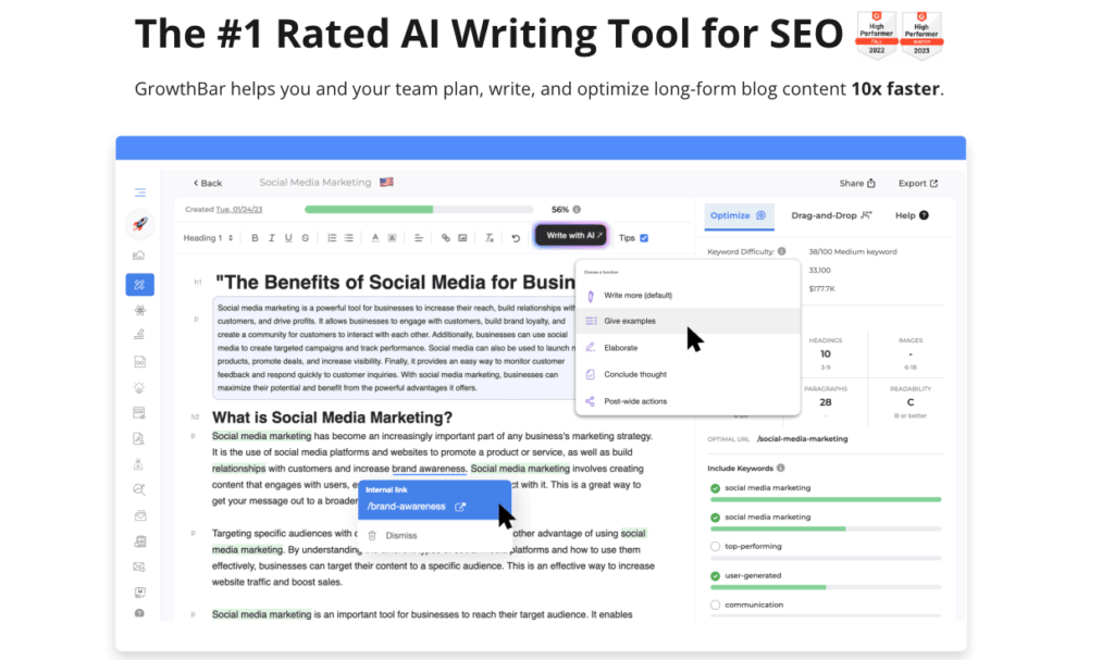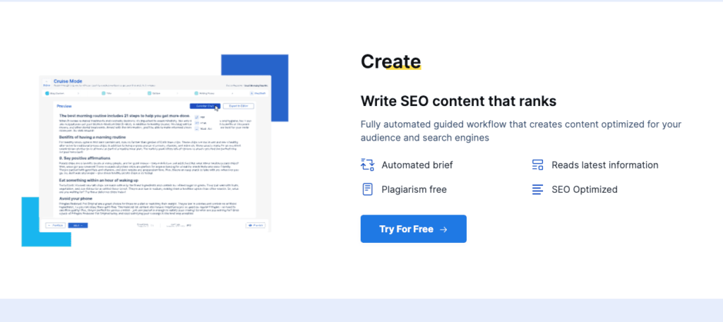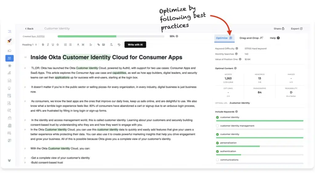 - SEO optimization through tools like Surfer SEO and keyword suggestions.