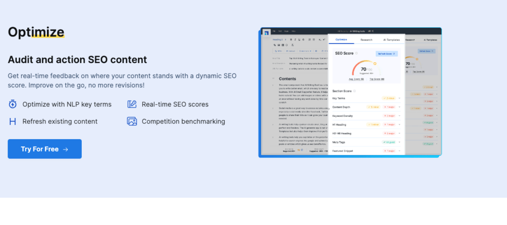 - Offers collaboration tools, plagiarism checking, and real-time content improvements.