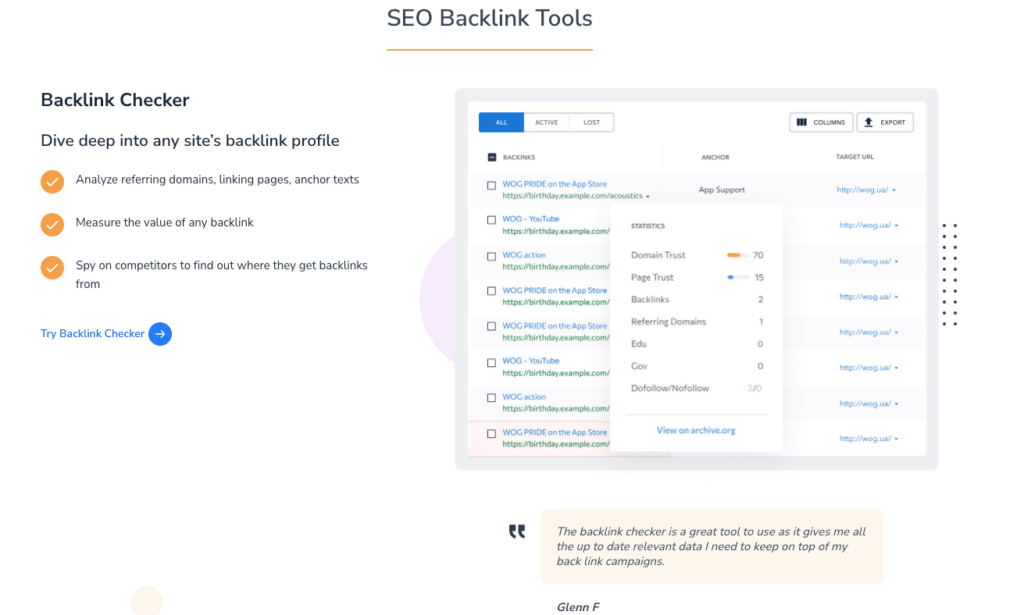 - Backlink Analysis: Mangools offers a backlink analysis tool that allows users to explore their own backlink profile and analyze the backlink profiles of competitors. This feature helps businesses understand their link-building efforts and identify opportunities for improvement.