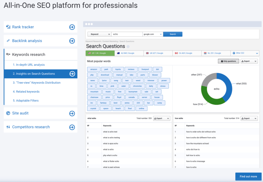 - Backlink analysis reveals link-building opportunities and competitor insights.