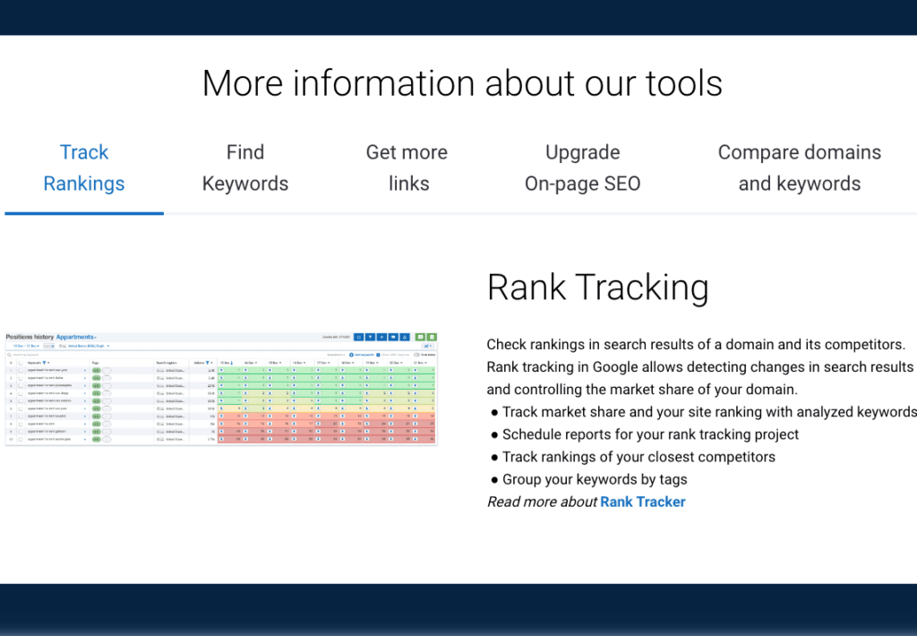 - Tracking: SEO tools can help us track our website’s ranking and visibility over time, as well as monitor our competitors’ rankings. This can help us make data-driven decisions about our SEO strategy and adjust our tactics as needed.