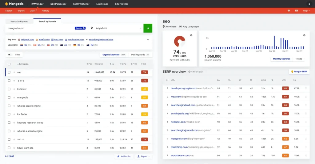 - Keyword Research: Mangools provides a powerful keyword research tool that helps users find relevant keywords with accurate search volume and keyword difficulty metrics. It enables businesses to identify high-potential keywords for their content and SEO strategies.
