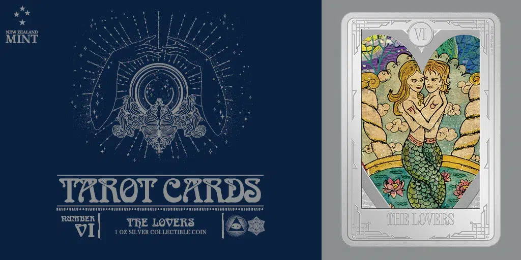 - 1oz pure silver coin shows a coloured and engraved representation of The Lovers, on a rectangular coin – to mirror the shape of a Tarot card.